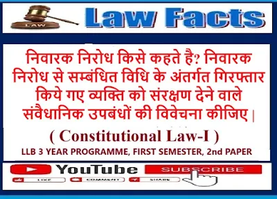 निवारक निरोध - संविधान में 'निवारक निरोध ' को कोई परिभाषा नहीं दी गई है , किन्तु उसका उद्देश्य अपराधों को रोकना है, यदि सरकार को यह आशंका है कि यह व्यक्ति या व्यक्तियों का कोई समूह अभ्यस्त अपराधी है या आपराधिक उद्देश्य पोर करने वाला है, जिसे सरकार ने प्रतिबंधित कर रखा है, तो सरकार पहले से उन्हें ऐसा करने से रोकने के लिए निवारक विधि के अंर्तगत गिरफ्तार करके जेल में निरुद्ध रख सकती है | अस्तु निवारक निरोध दंडात्मक नहीं है, बल्कि केवल निवारक है | अनु० 22 निवारक निरोध के लिए, एक विशिष्ट प्रक्रिया विहित करता है, जो अनु० 22 के खण्ड (4) से लेकर खण्ड (7) तक में निम्नलिखित उपबंधो में विहित की गई है |